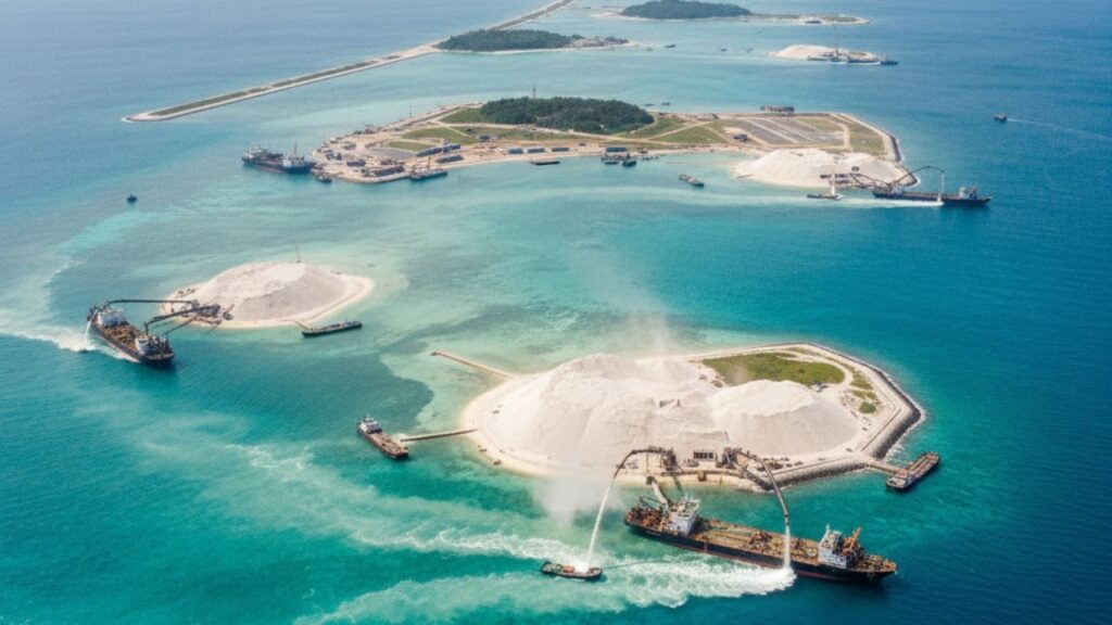 By depositing millions of tonnes of sand onto shallow coral reefs, China has carried out one of the most dramatic geographic transformations on the planet. Across the Spratly and Paracel island chains, areas once visited only by fishermen and storms have become fully formed artificial islands in less than a decade. Up close, the work appears almost mundane—pipes, pumps, sediment, concrete. From a distance, it feels astonishing, as if coastlines are no longer inherited but deliberately chosen.