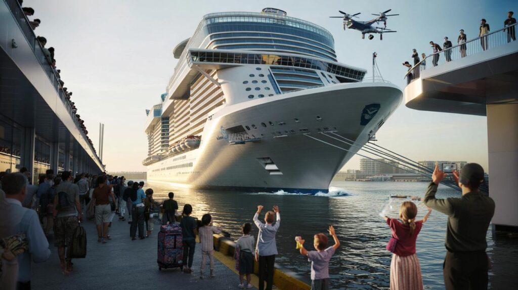 The dock is humming long before sunrise. Families drag wheeled suitcases over the concrete, kids craning their necks, trying to glimpse the thing everyone’s been talking about. Above them, a wall of glass and steel rises out of the fog, so tall it seems to edit the skyline, swallowing the last stars above the harbor.