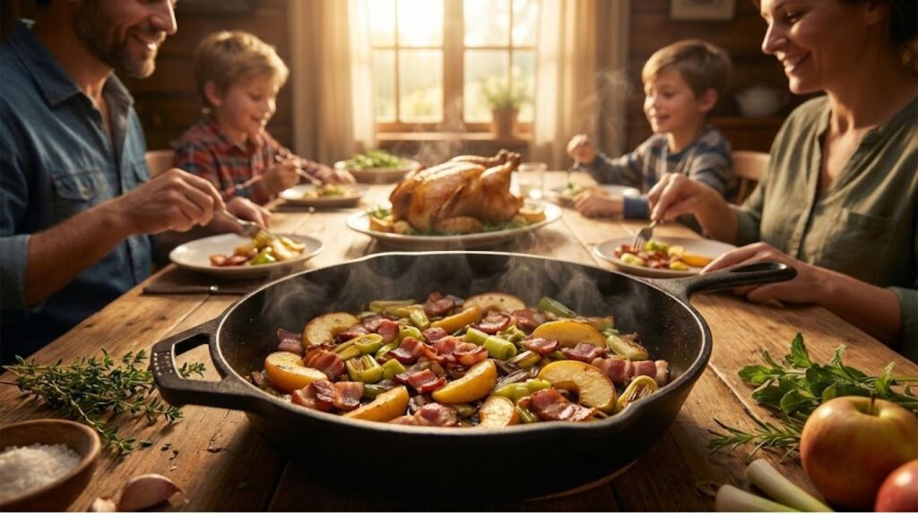 The beauty of this leek, apple, and bacon skillet is how it tastes like hours of effort when it actually demands very little. The leeks soften and turn sweet, the apples catch and caramelise at the edges, and the bacon adds that salty, smoky depth that convinces everyone they’re eating a proper meal.