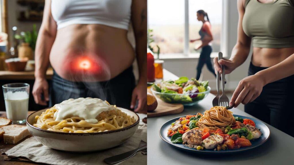 | White pasta alone as main bulk of the meal | Half plate vegetables, quarter protein, quarter whole carbs | Reduces total starch load, improves fullness and metabolic response |