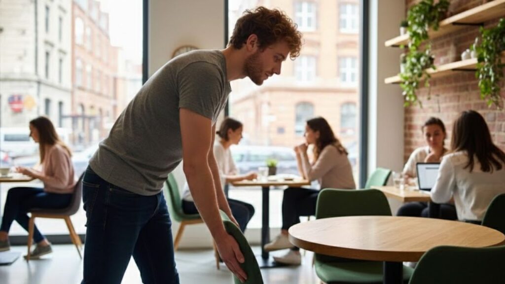The man paused, slid a chair under the table, stepped aside to make space for others, and offered a brief apologetic smile. There was no performance. Just small adjustments that made the room easier for everyone else.