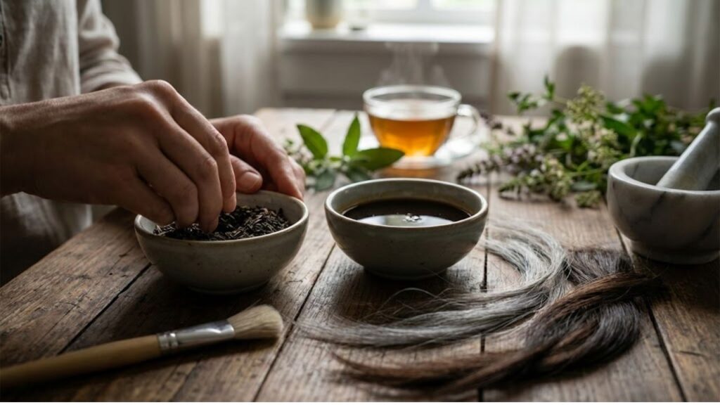 To make the dye, brew a concentrated black tea, let it cool, then mix it with freshly brewed, cooled coffee. This creates a “hair espresso” with rich tannins and pigments that cling particularly well to gray strands.