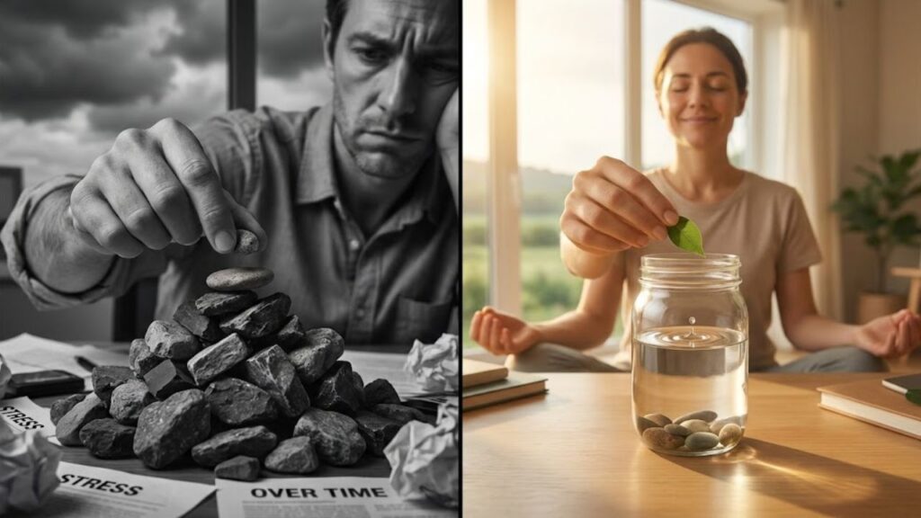 Here’s the truth: stress rarely comes from one single thing; it comes from accumulation. The human nervous system wasn’t designed for constant, low-grade pressure with no way to release it. Your brain is always scanning for unfinished tasks, unresolved conversations, and unaddressed fears. Each of these open loops uses up mental energy. When there’s no time to “clear the board” at the end of the day, these loops stack up. You go to bed carrying yesterday’s stresses into today’s clean slate, like dragging yesterday’s laundry into today’s pile. Over time, this changes not only how stressed you feel but also how quickly new stress sticks to you.